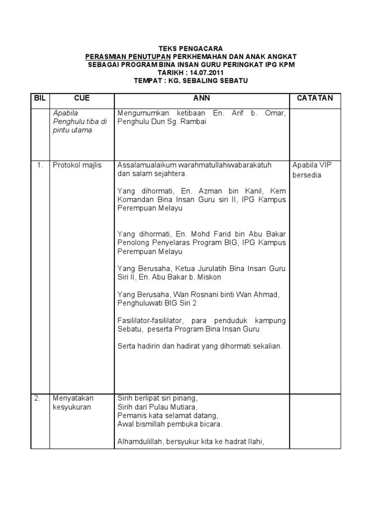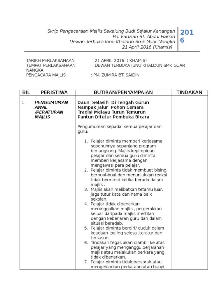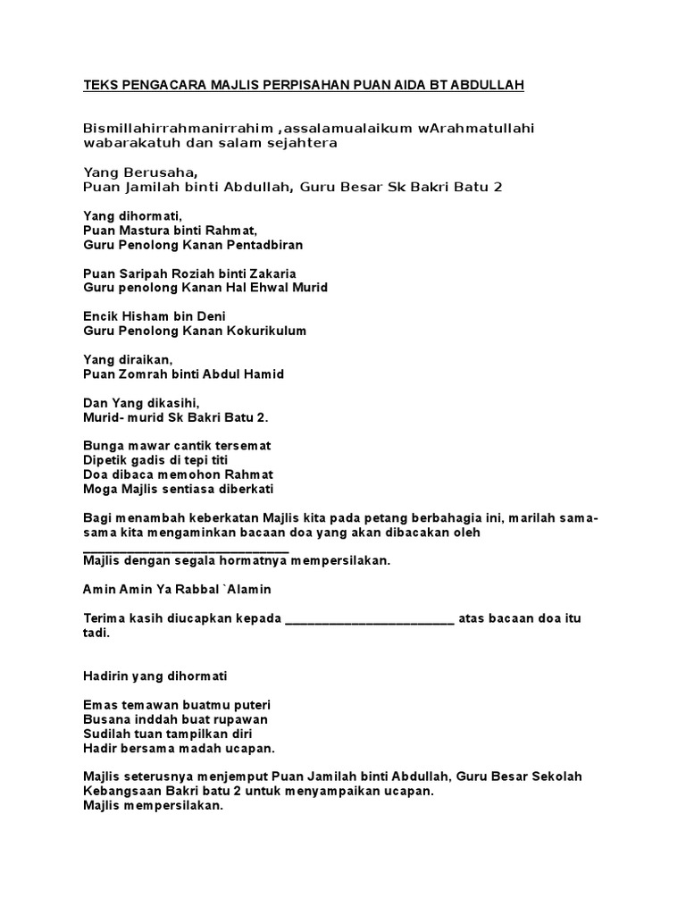 Selain majlis perkahwinan, ruangan untuk seminar, mesyuarat atau majlis yang kecil seperti sambuntan hari jadi, akikah, pertunangan juga ada doa majlis perkahwinan ini biasanya akan dibacakan oleh wakil pihak tuan rumah seperti ayah, abang, pak cik saudara ataupun iman jemputan. Download pdf skrip pengacara majlis hari penyampaian hadiah 134w6d7y9mn7. Dengan demikian majlis menjemput dgn segala hormatnya mempersilakan alfadil ustaz haji. Skrip pengacara majlis oracle think camp polaris5720 skrip pengacara. Kami bawakan kepada anda majlis perpisahan sempena persaraan pn bedah bt lahman, guru penolong kanan hem sekolah kebangsaan chepir.
