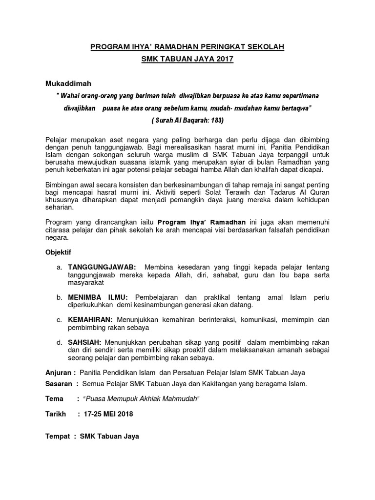 Smk seri pantai, kuala lumpur kertas kerja ihya' ramadhan 1440h peringkat sekolah smk seri View kertas kerja ihya ramadhan 2019.doc from bba 8217 at islamic science university of malaysia. Apr 19, 2020 · kertas kerja program ihya' ramadhan 2020 / 1441 sekolah kebangsaan ayer tawar, 32400 ayer tawar 1. Kertas kerja ihya ramadhan sekolah menengah. Oct 24, 2013 · kertas kerja program ihya ramadhan 1434h sekolah agama menengah tinggi tengku ampuan rahimah 1.0 tujuan tujuan kertas kerja ini adalah untuk disampaikan kepada tuan pengetua samttar untuk kebenaran dan kelulusan kewangan bagi menjayakan program ihya' ramadhan 1434h yang telah dirancang.