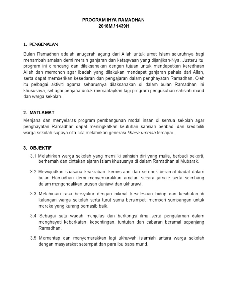 Umat islam seharusnya menerima kehadiran ramadhan dengan penuh kegembiraan dan berusaha merebut segala ganjaran yang dijanjikan kepada hamba nya yang berpuasa dan melakukan amalan soleh. Oct 24, 2013 · kertas kerja program ihya ramadhan 1434h sekolah agama menengah tinggi tengku ampuan rahimah 1.0 tujuan tujuan kertas kerja ini adalah untuk disampaikan kepada tuan pengetua samttar untuk kebenaran dan kelulusan kewangan bagi menjayakan program ihya' ramadhan 1434h yang telah dirancang. Umat islam seharusnya menerima kehadiran ramadhan dengan. Panitia pendidikan islam sk seliau pendahuluan dengan nama allah yang maha pengasih lagi maha penyayang. Kertas kerja program ihya ramadhan sk bandaran.