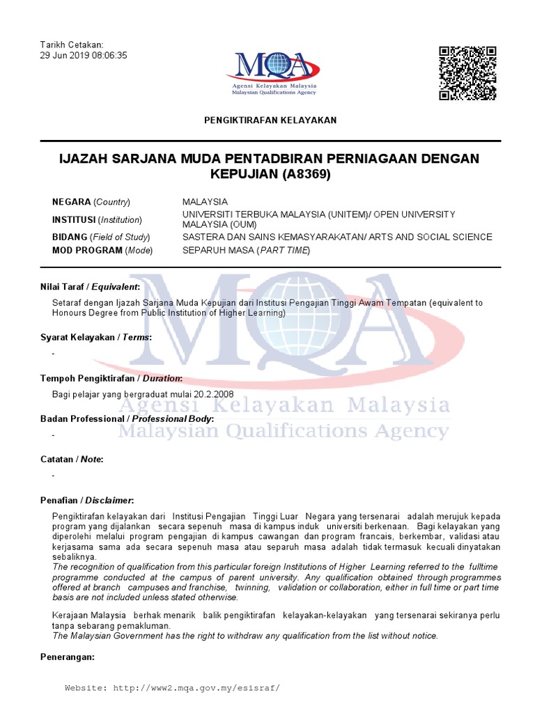 Diploma lanjutan perakaunan/ijazah sarjana muda perakaunan (kepujian) nilai taraf ( equivalent ) : Pismp ambilan jan 2012 pendidikan islam 2 panduan mencetak sijil pengiktirafan kelayakan mqa. Sechenov moscow medical academy/ moscow medical academy kennesaw state university/ kennesaw state college, kennesaw, georgia a.b. Senarai tambahan kelayakan yang diiktiraf oleh kerajaan yang perlu digunakan dalam urusan pelantikan ke dalam perkhidmatan awam. Bagi pengiktirafan kelayakan pengajian di peringkat ijazah sarjana dan ph.d, kerajaan malaysia telah menggunapakai dasar sedia ada seperti yang terkandung dalam surat pekeliling perkhidmatan bilangan 7 tahun 2010 dan surat pekeliling perkhidmatan bilangan 13 tahun 2009.