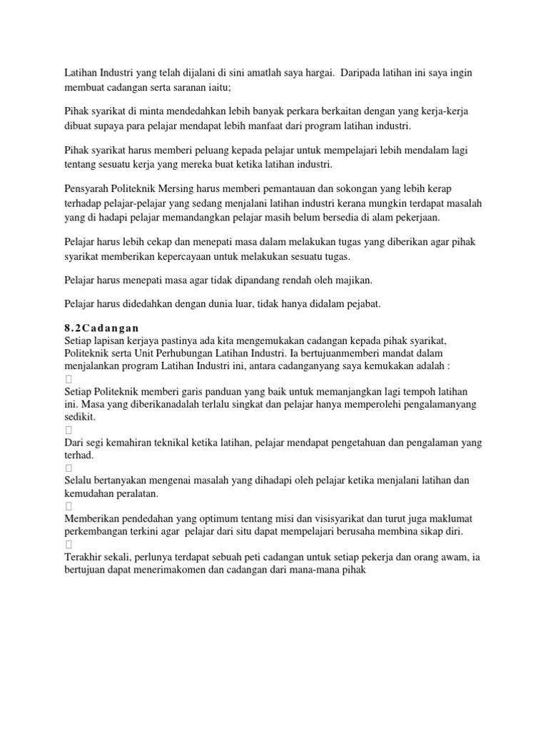 Laporan Akhir Li from imgv2-2-f.scribdassets.com Sesetengah mahasiswa menganggap bahawa latihan industri ni bukanlah suatu yang penting pun. Artikel ini adalah gabungan syaraikat syarikat yang menawarkan latihan industri ( tempat praktikal. Page ini hanya sebagai platform penghubung antara pelatih dan industri. You have just read the article entitled syarikat yang menawarkan latihan industri di sabah. Laporan latihan industri yang telah lengkap akan dihantar dan akan disemak oleh pensyarah bagi tujuan pemarkahan. Latihan industri (li) salah satu syarat mandatori bagi majoriti kos pengajian sebelum menamatkan pengajian di peringkat diploma atau ijazah adalah di swasta mudah sahaja, jika anda menunjukkan prestasi yang baik sepanjang li, peluang yang tinggi untuk terus ditawarkan bekerja disitu. Latihan industri di ibu pejabat mosti menekan aspek pengurusan tanpa melibatkan aktiviti teknikal / makmal. Perkhidmatannya kepada semua jenis perniagaan tidak kira syarikat individu, perniagaan.